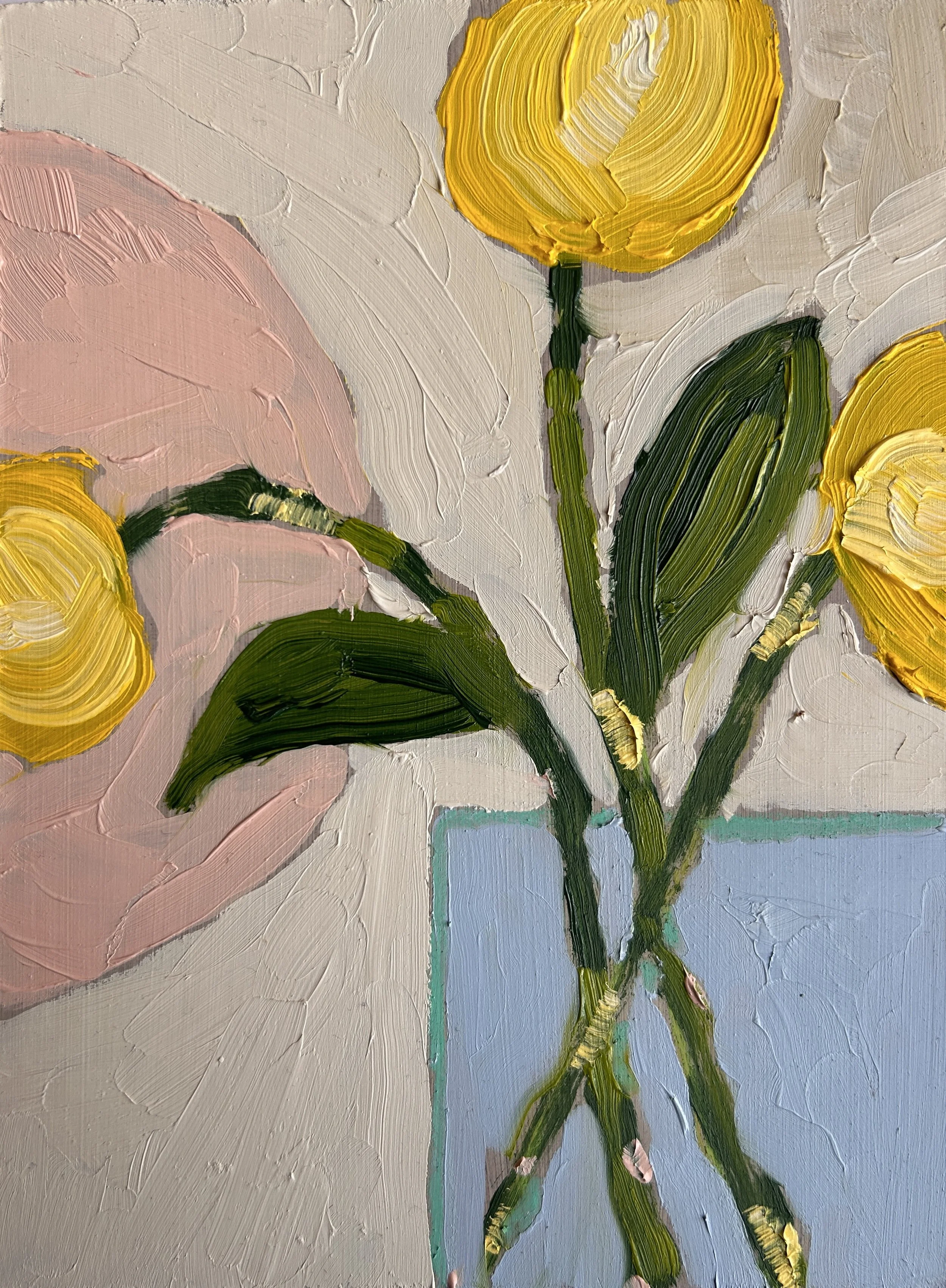 Abstract floral oil painting on panel. This painting is 6in x 8in. This painting comes framed in a very pale grey box frame ready to hang or gift.